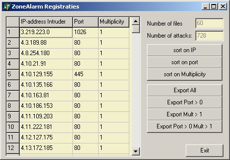Hiernaast is een lijst geplaatst van hinderlijke (en minder hinderlijke) aanvallen op mijn systeem, die werden onderschept door Zone Alarm. Helaas kan ik de werking van ZoneAlarm niet nagaan, maar ik veronderstel dat er toch wel een aantal serieuze pogingen tussenzaten om mijn systeem omver te krijgen.